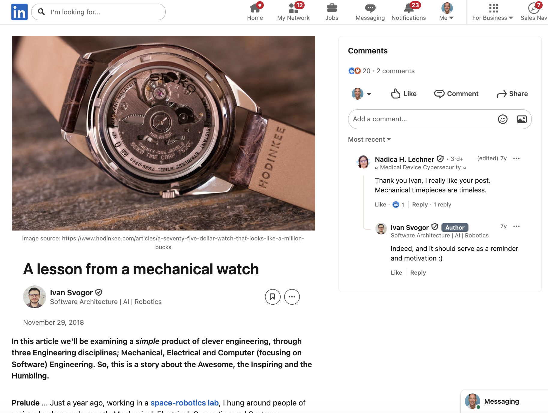 The input is a LinkedIn article by Ivan Svogor about lessons from mechanical watchmaking.